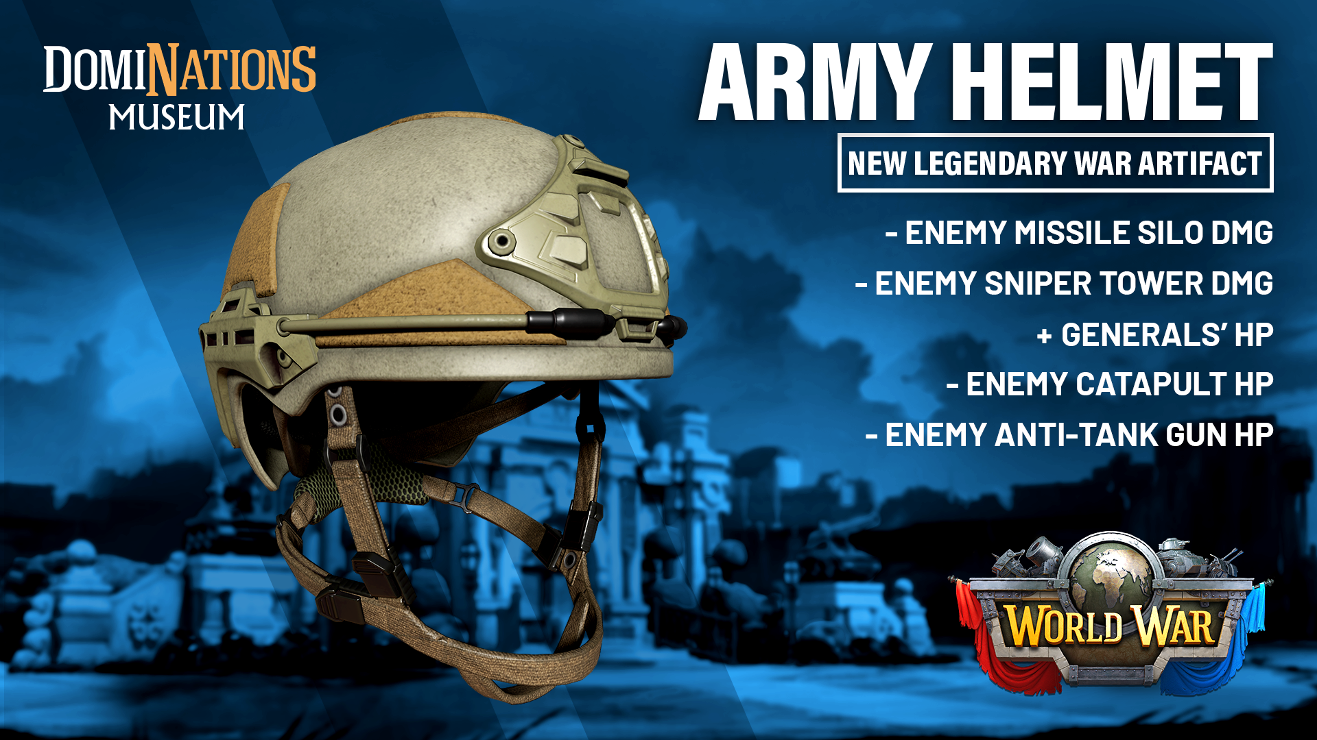 This year’s Anniversary Chest you’ll be able to collect across various spaces in DomiNations! Included will be the brand new Legendary Artifact, the DomiNations Army Helmet, as a potential drop.