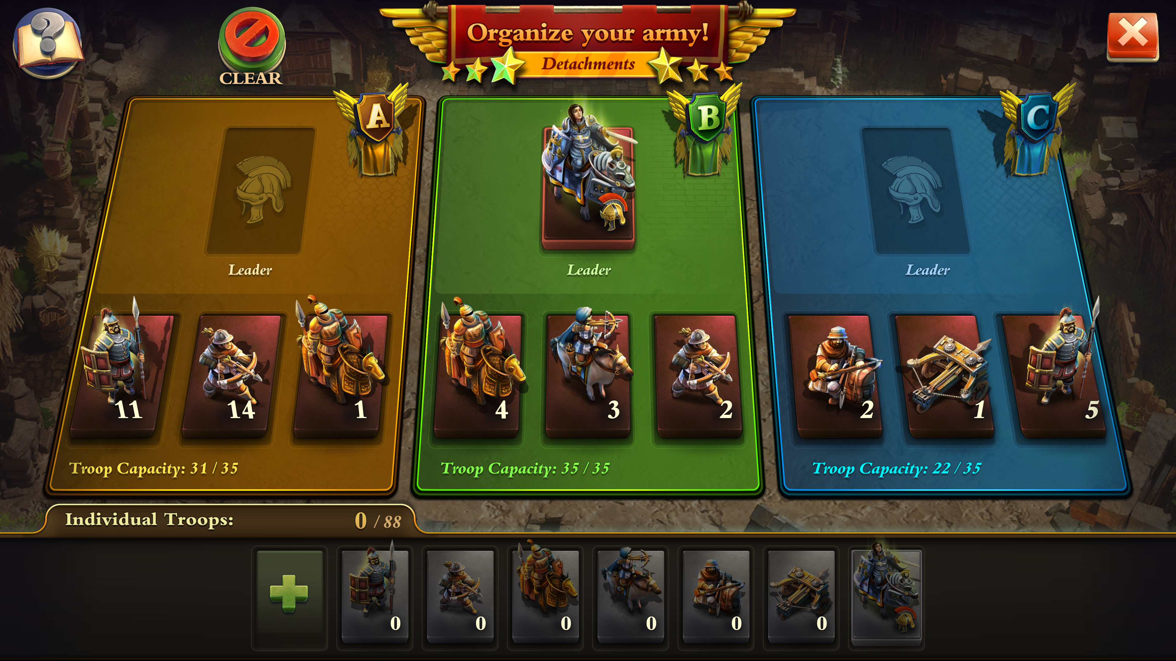 Organize groups of barracks troops, factory troops, and generals into up to three detachments using the new Detachment Editor. Each detachment may contain up to one Leader and three Supporting Units. Only a General may be assigned as a Leader, while Supporting Units may include barracks troops, factory troops, as well as other Generals.