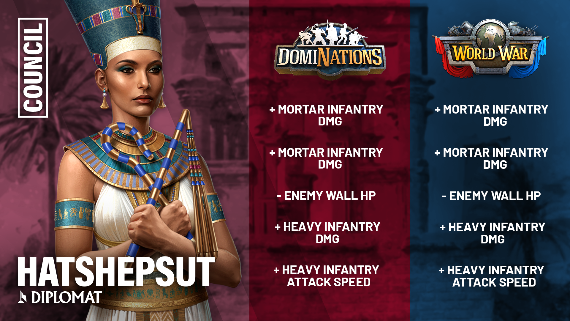In DomiNations Hatshepsut will improve the effectiveness of Mortar and Heavy Infantry while reducing Enemy Wall Strength.