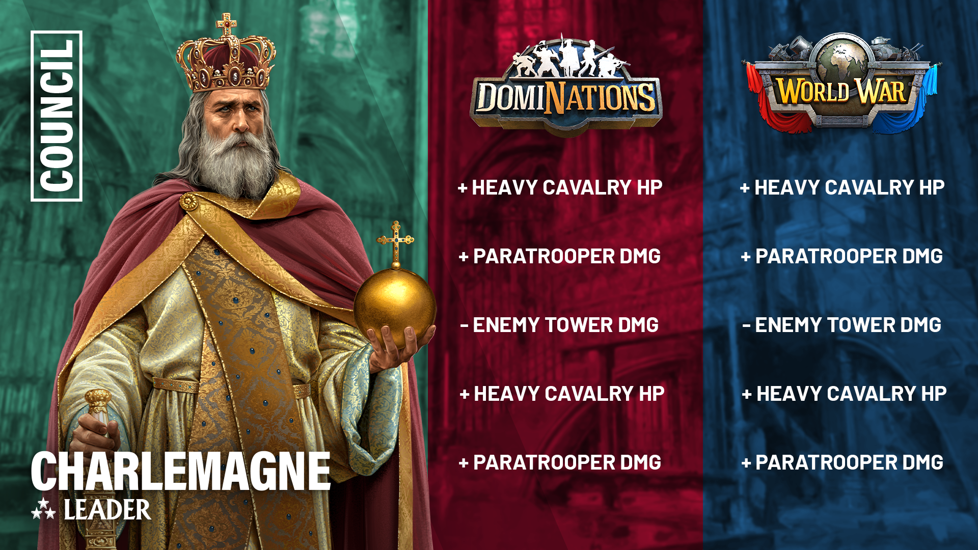 In DomiNations, his stats will increase the damage output of your Paratroopers and increase the HP of your Heavy Cavalry in both Primary and War Hall versions. You can start recruiting Charlemagne on 6/9!