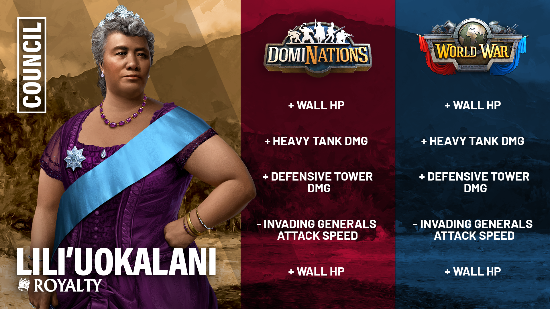 Queen Lili’uokalani is of the Royalty Duty in Dominations. Adding her to your Council Chambers will strengthen the walls of your base and increase the damage from your Towers and Heavy Tanks.