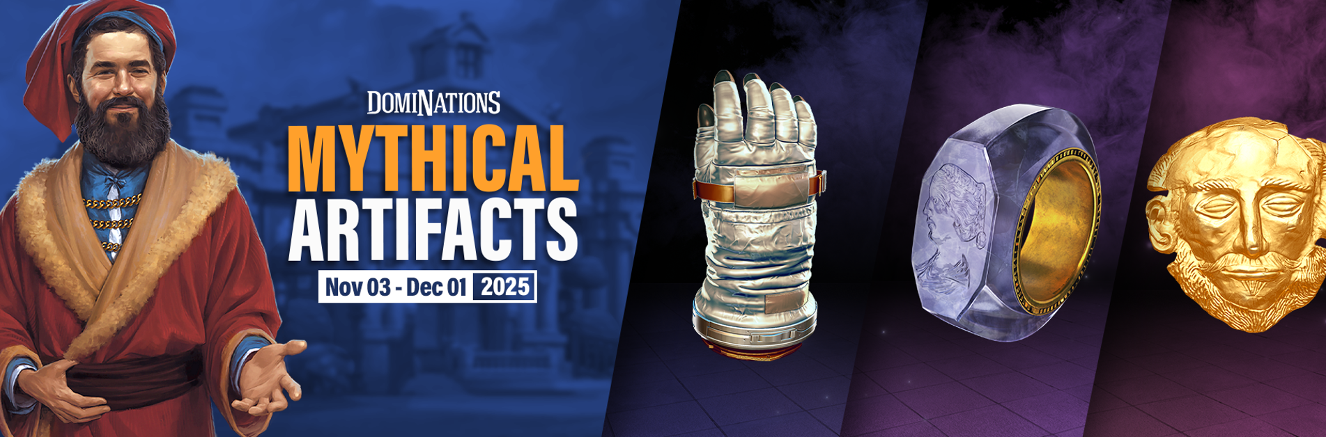 Marco brings three Mythical Artifacts for you to collect with your Legendary Tokens! Mythical Gemini 8 Glove, Caligula's Ring, and Mask of Agamemnon will be available for 1000 Legendary Tokens from 11/3 to 12/1.