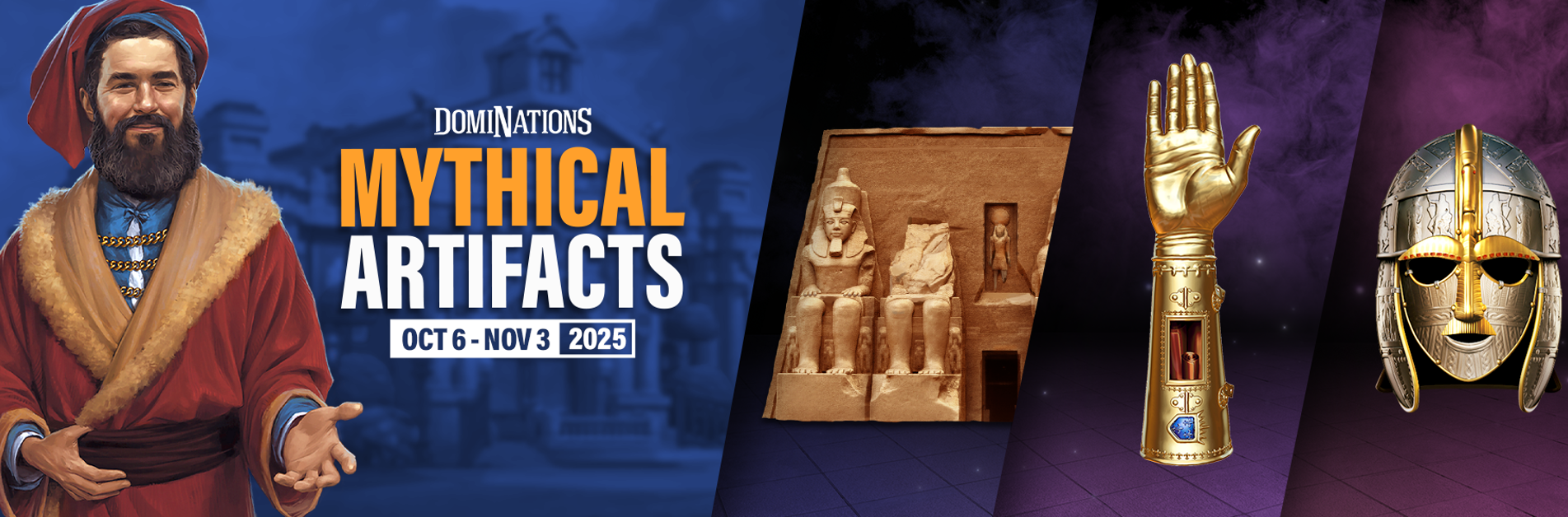 Marco brings three Mythical Artifacts for you to collect with your Legendary Tokens! Ramesses II's Abu Simbel, the Arm Reliquary of Charlemagne, and Sutton Hoo Helmet will be available for 1000 Legendary Tokens from 10/6 to 11/3.