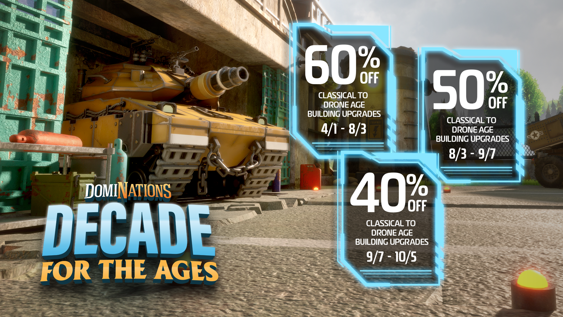 Decade for the Ages discounts will return on 4/1/2026, starting with the 60% resource discount and Age Rush. Race through your upgrades and take advantage of the instant Town Center Upgrades for a limited time. The 50% Resource discount begins 8/3/2026, and then finally 40% discount on 9/7/2026. Robotics Age upgrades are not included for these discounts.