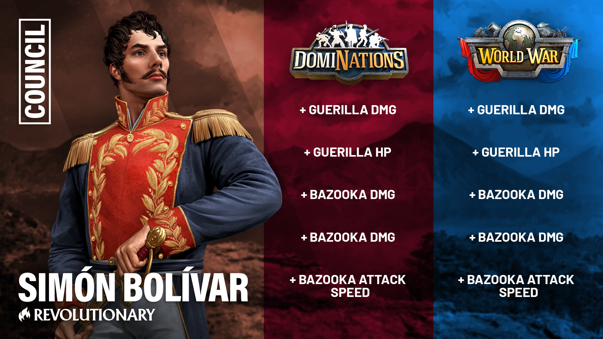 As a Councilor in DomiNations, Simón Bolívar will improve Guerrilla and Bazooka Troops in both Main and War Council Chambers. You can begin recruiting Simón Bolívar starting 10/28.