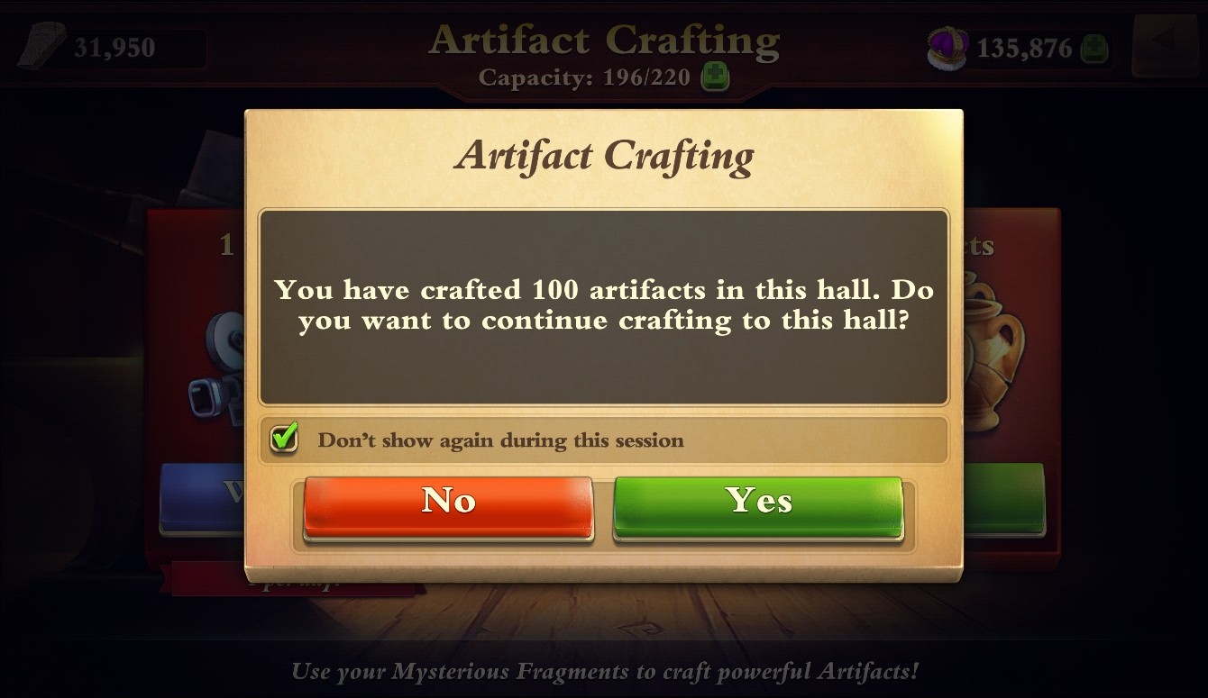 As a precaution for those who craft pretty quickly, we set up an alert where if you craft 100 Artifacts of the same Hall, a pop-up will appear confirming the Hall you’re crafting for.