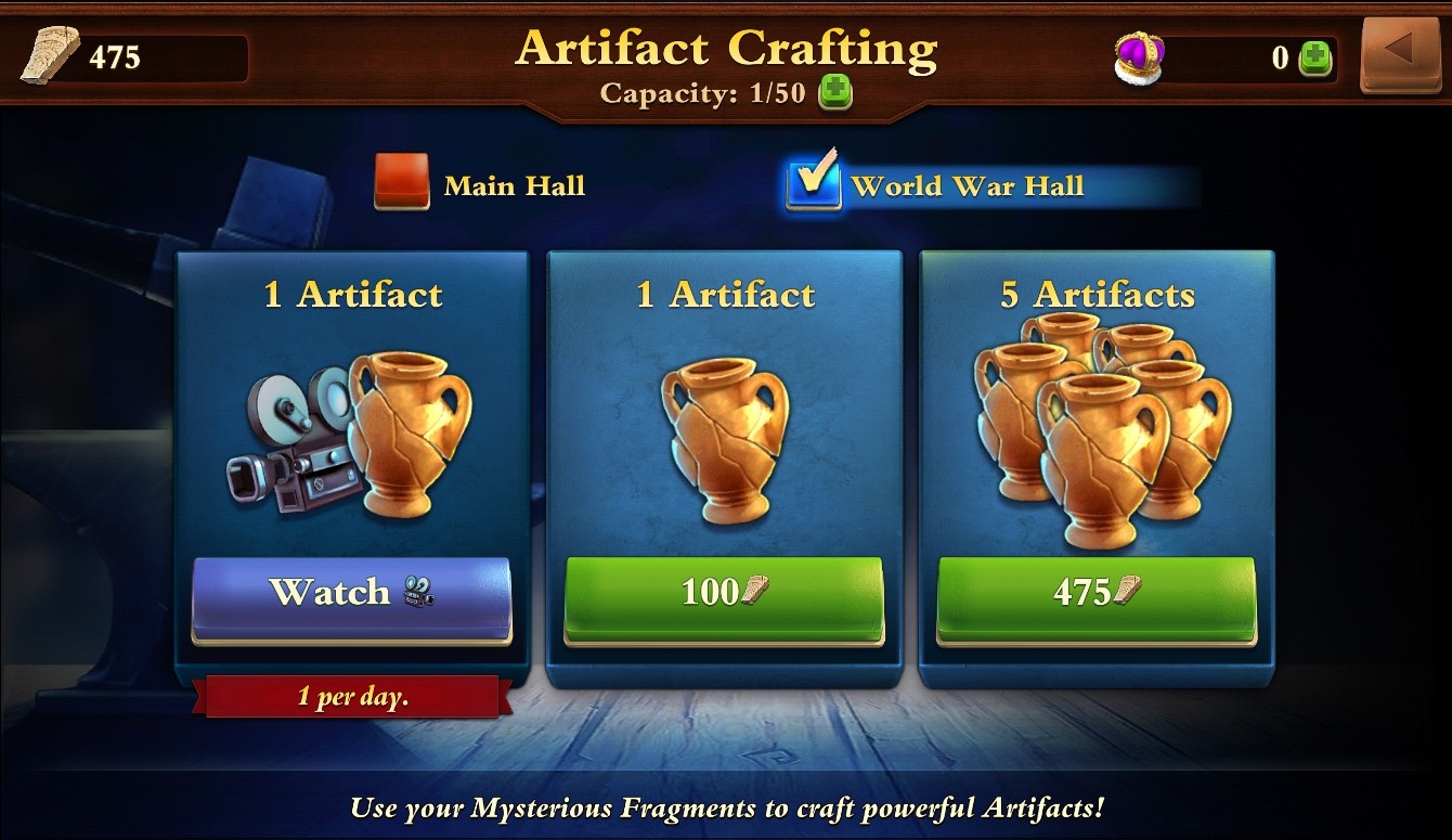 When you craft an Artifact, you’ll notice a new toggle at the top indicating whether you’re crafting for the Main Hall or War Hall.