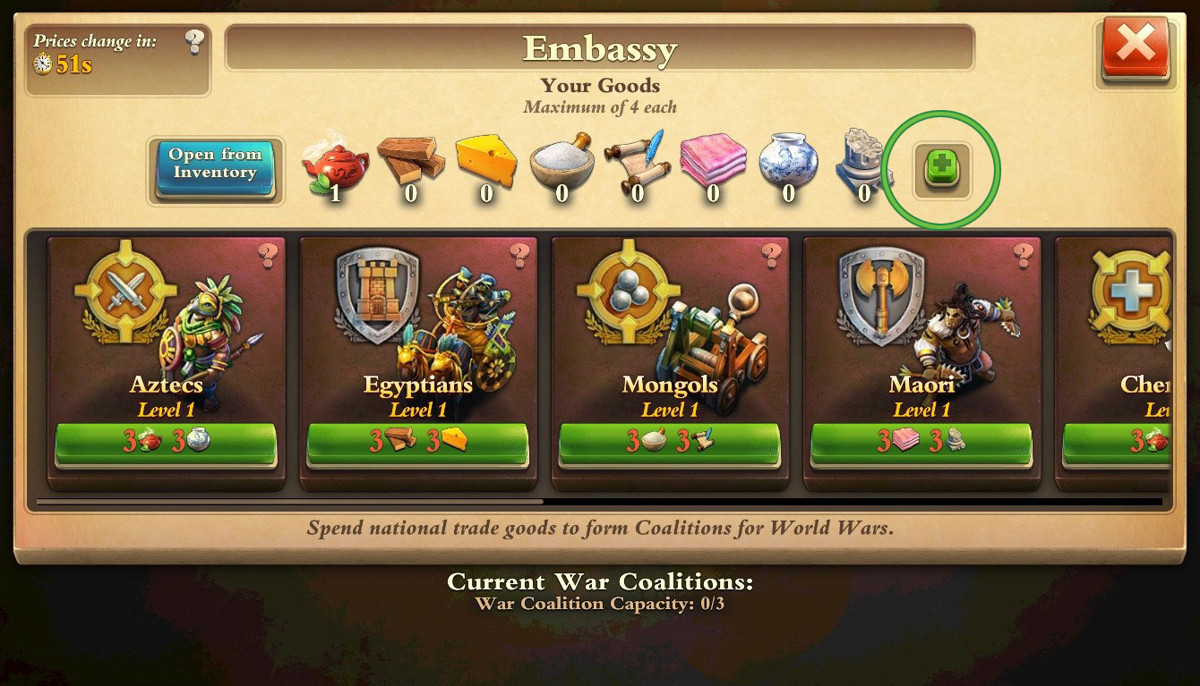 In this update, you can now add Coalitions to your Embassy if they’re in your inventory. This also includes the ability to add individual National Trade Goods directly from your inventory, as opposed to the previous feature that would only fill your capacity to maximum. This new button will appear in the Coalition menu.